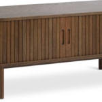 Comodă TV LYNGVIG 120cm 2 uși tambur stejar închis. Lemn masiv de stejar, furnir de stejar și furnir decorativ. Cu uși glisante tip tambur. 120x50x40 cm
